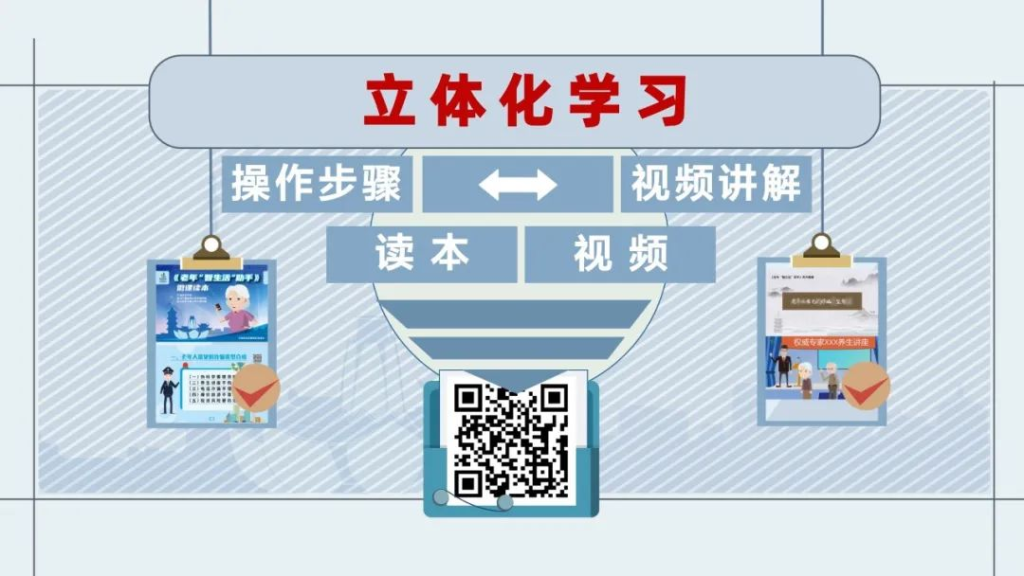 課程注重讀本操作步驟與視頻講解同步,線上與線下相融合。老年朋友在看讀本時(shí),可以使用微信掃二維碼,就可查看相應(yīng)的學(xué)習(xí)視頻。
